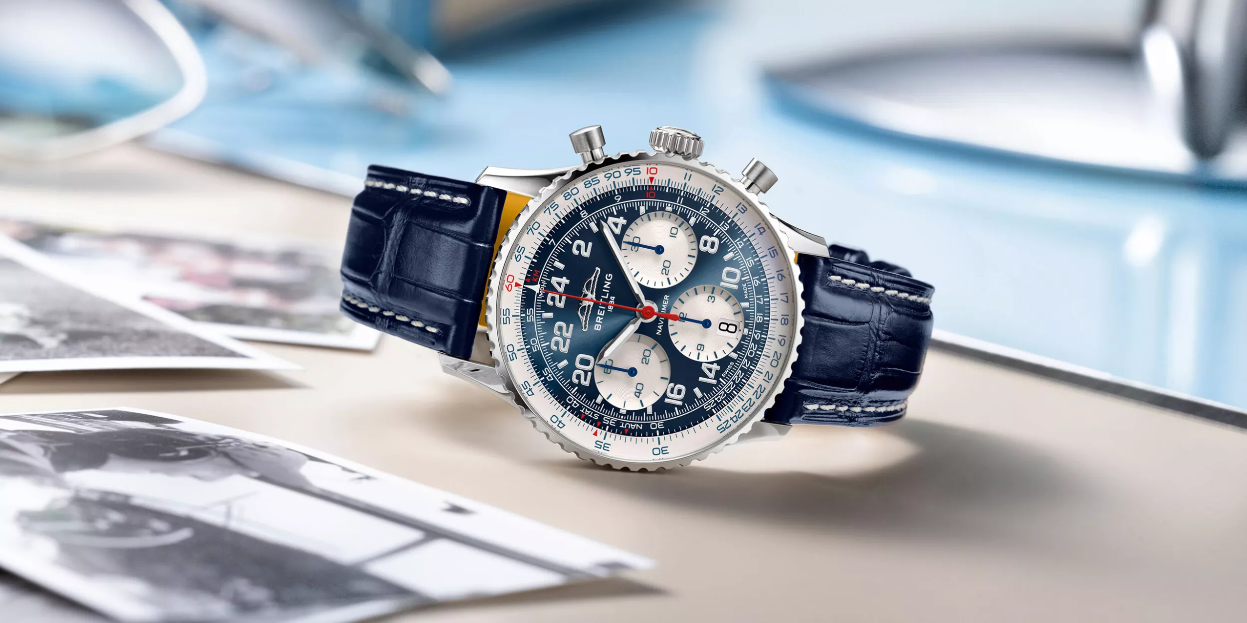 À 12 heures, le cadran arbore le logo ailé de l’Aircraft Owners and Pilots Association (AOPA), soulignant le rôle historique de la Navitimer en tant que montre officielle du plus grand club de pilotes au monde depuis sa création en 1952. La montre présente trois sous-cadrans pour les secondes, les minutes et les heures, ainsi qu’un discret guichet de date à 6 heures. Les poussoirs champignon garantissent un fonctionnement fluide, tandis que l’aiguille des secondes, de couleur rouge vif, facilite la lisibilité.