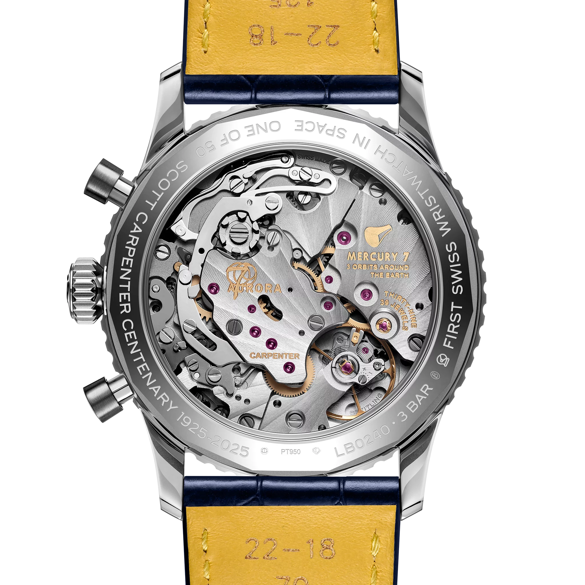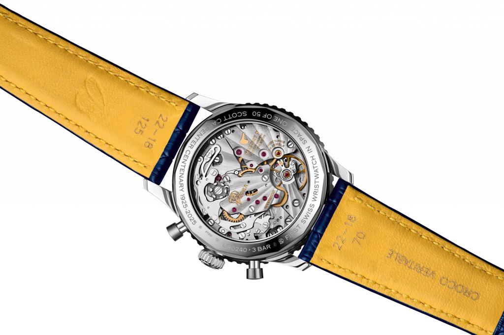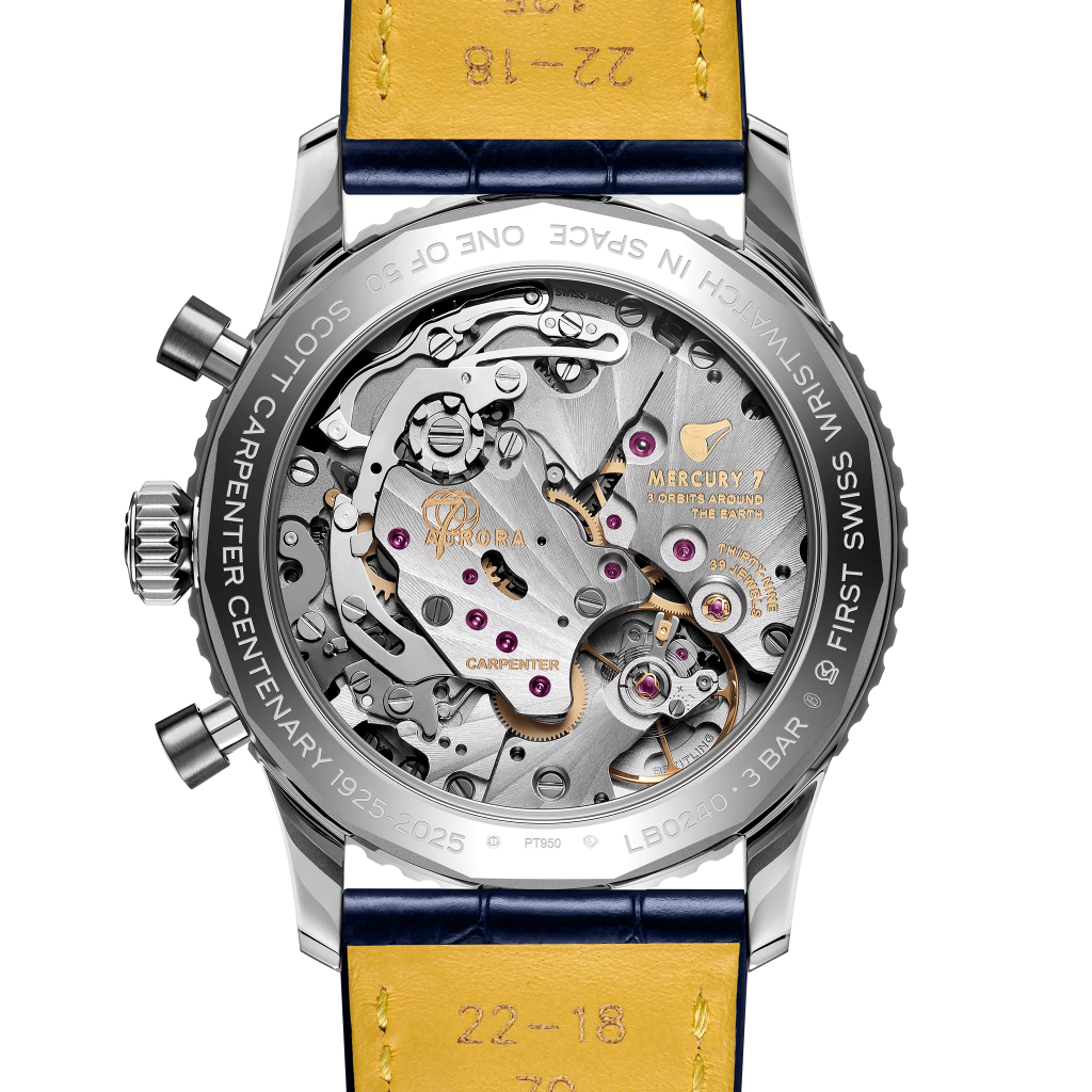 Le mouvement certifié COSC offre une réserve de marche d’environ 70 heures et est visible à travers le fond de boîtier en saphir. Des gravures uniques sur le pont rendent hommage à Scott Carpenter avec les inscriptions « Carpenter », le nom de sa capsule « Aurora 7 », « 3 orbits around the Earth » ainsi que le nom du premier groupe d’astronautes de la NASA « Mercury 7 ». D’autres gravures sur le fond du boîtier indiquent « First Swiss wristwatch in space », « One of 50 » et « Scott Carpenter Centenary 1925-2025 ».