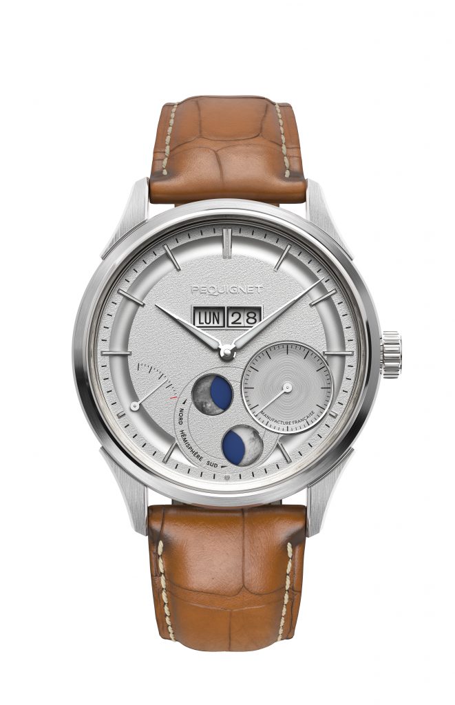 Avec ses nouvelles dimensions — le boîtier en acier redessiné arbore un diamètre de 39,5 mm contre 41 pour sa précédente version et sa lunette affinée de 0,75 mm —, la Royale Paris gagne en polyvalence et s’accorde idéalement à tous les poignets, notamment grâce à son confortable bracelet en cuir marron clair attaché aux cornes rapportées. Esthétique et technique, cette référence permet d’accéder à l’univers de la haute horlogerie. Toutes les finitions sont exemplaires comme celles de la double Lune confectionnée à partir de photographies du satellite terrestre. Elle offre une visualisation réaliste des hémisphères nord et sud dans des guichets rehaussés sur leur pourtour respectif d’un délicat diamantage.