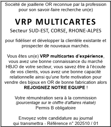 Rubrique « Offre d’emploi » concerne l’annonce : VRP MULTICARTES d’expérience, secteur SUD-EST, CORSE, RHONE-ALPES…