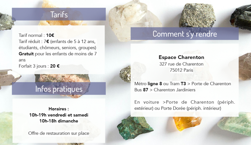 Ne manquez pas notre programme de conférences gratuites par notre sélection d’experts, les animations sur stand, l’exposition thématique… Vous trouverez aussi de nombreuses animations : démonstrations de taille de pierres, identification gratuite de gemmes…